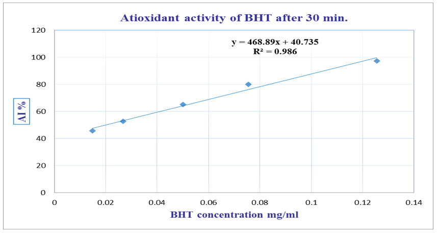 Figure 3 Antioxidant activity of the positive control (BHT) measured by DPPH radical scavenging assay after 30 minutes.