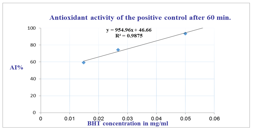 The antioxidant activity of C. incana essential oil after 60 minutes of incubation is shown in Figure 4, demonstrating its free radical scavenging capacity over time. For comparison, the antioxidant activity of the positive control, BHT, under the same conditions is presented in Figure 5.