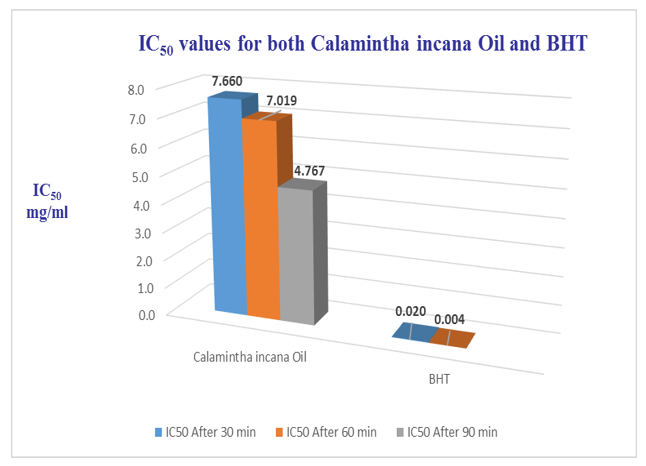 The IC₅₀ values calculated after 60 minutes of incubation were 7.019 mg/mL for C. incana essential oil and 0.004 mg/mL for BHT. These results indicate that, although the antioxidant activity of the oil improved slightly over time, it remains considerably lower than that of the positive control.