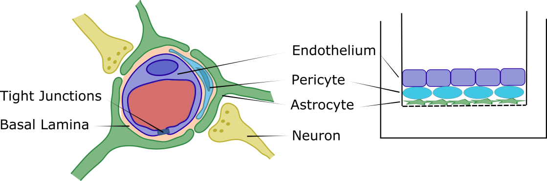 Figure 1 Cross sectional depiction of the Blood-Brain Barrier within the neurovascular unit (NVU) with the endothelium (BMECs) lining the capillary, pericytes embedded within the basal lamina, astrocytes having nearly full coverage of the BMECs and surrounding pericytes, and neurons in close contact with the astrocytes (left). The direct contact triculture model on the apical surface of a Transwell® filter support mimicking the in vivo NVU. Astrocytes are seeded first on the filter, followed by pericytes, then BMECs to generate a fully apical, direct contact triculture model (right).