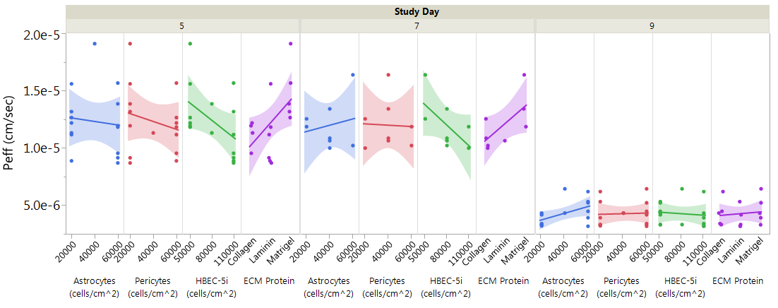 Based on the data trends, the culture length between the assay day was determined to have the largest impact on paracellular permeability resulting in significantly lower 4kD dextran permeability at day 9 compared to days 5 and 7. When separating the data by study day and factor there are observable trends in permeability coefficients among the factors including the effects of astrocyte and pericyte cell density. With extended culturing, higher seeding densities of astrocytes and pericytes result in higher permeability of the dextran (Figure 3). HBEC-5i seeding density also shows trends towards lower permeability at higher seeding densities; however, this trend is not as strong at day 9 when the cells have had sufficient time to reach confluence and have a longer time to differentiate.