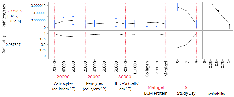 Figure 4 JMP 13.2 Prediction Profiler generated based on maximizing desirability for Peff based on DOEP. Optimal plating conditions 20,000 cells/cm2 astrocytes and pericytes, 80,000 cells/cm2 HBEC-5i, Matrigel, and 9 days of endothelial growth. Predicted Peff of 2.4 x 10-6 cm/sec for optimal conditions.