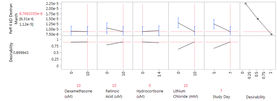 Figure 6 JMP 13.2 Prediction Profiler generated based on maximizing desirability for Peff of DOEM2. Optimal medium conditions 10µM dexamethasone, 10µM retinoic acid, 10mM LiCl, through 7 days of endothelial culture. Predicted Peff of 8.8 x 10-6 cm/sec for optimal conditions.