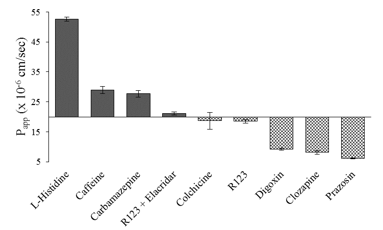 The antipsychotic drug clozapine showed an apparent permeability value of 8.15 x 10-6±0.58cm/sec. The amino acid L-histidine was used to assess facilitative transport across the in vitro model with an observed apparent permeability of 52.61 x 10-6±0.70cm/sec, as reported previously.60 Carbamazepine is an antiepileptic drug and a BBB positive permeant with an observed apparent permeability of 27.71 x 10-6±1.13cm/sec in the optimized model. Caffeine, a small hydrophilic molecule, also had BBB positive permeation with an obtained apparent permeability of 28.93 x 10-6±1.15cm/sec (Figure 8).