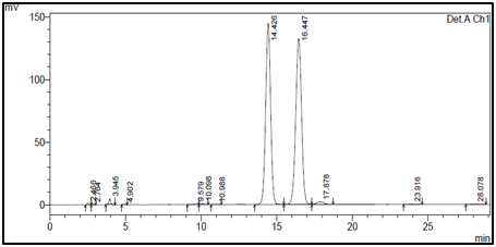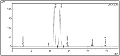 Twenty tablets were weighed. An accurately amount of the finely powdered tablet equivalent to 120mg of cefuroxime Axetil was taken and transferred into a 100mL volumetric flask fifty a mL of methanol was added, shaked by mechanical means for about 10minuts and diluted with methanol to volume. The resultant solution was filtered through 0.45μm syring filter. The first 10mL was discarded and 10mL of filtrate was transferred into a 50mL volumetric flask, diluted with mobile phase to the mark and twenty μL was injected. A portion of the standard solution was exposed to sunlight for 5 hours to generate E-isomers. A portion of the standard was heated for 1 hour or more at 60 ℃ temperature to generate the ∆^3-isomers.