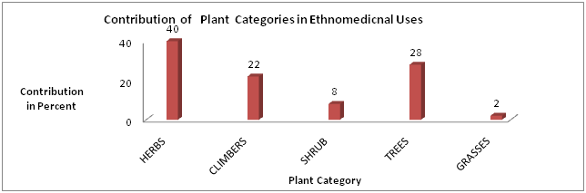In the present investigation, 50 plant species belonging to 27 families under 41 genera were documented which were being traditionally used in six cited clusters in Chhindwara districts. The herbal remedies are effective against 20 ailments such as Leucoderma, sun-stroke, skin burn, skin disease, boils, baldness and hair problems, male and female impotency, leucorrhoea, lactation, heart ailments, blood pressure, diabetes, intestinal worms, scorpion sting, snake–bite, jaundice, fracture and loss of appetite. Among the prevalent plant species maximum plant contribution was recorded in six cluster of villages for herbs with 20 species (40%), followed by trees with 14 species (28%), climbers with 11 species (22%), shrubs with 4 species (8%) and grasses with 1 species (2%) as shown in Figure 2. The formulation being used by 50 species were grouped into formulation used with number of species such as powder, paste, decoction, oil, raw, roasted etc. as shown in Figure 3. The contribution of plant parts of the 50 preferred species was maximum for leaves with 11 species (22%), followed by use of seeds of 9 species (18%) as well as roots with 9 species (18%), followed by use of bark with 5 species (10%), followed by use of whole plant (Panchang) with 4 species (8%), followed by use of fruits with 03 species (6%), as well as use of wood with 03 species (6%), followed by use of rhizome with 2 species (4%), followed by use of bulb, flower, tuber and stem with 1 species each of four parts (2%) of their contribution as shown in Figure 4.