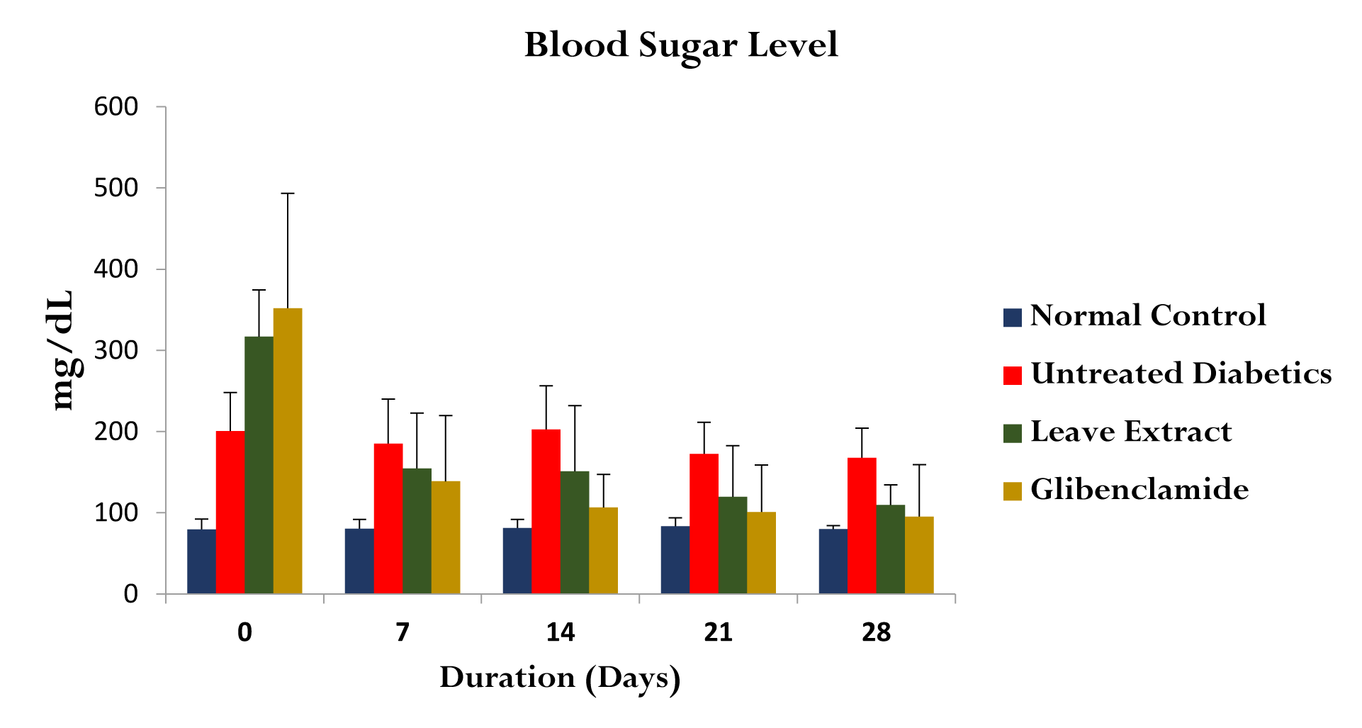 Figure 1 revealed the hypoglycemic ability of B. ferruginea leaf extract on male wistar rats. After 14days of acclimatization, the rats were intraperitoneally injected 50mg/kg streptozotocin (STZ) except for group 1 (normal control). Hyperglycemia was confirmed after 48hours of STZ injection, as they was a significant increase (p<0.05) in blood sugar levels in the entire group that received STZ in comparison with the normal control (Day 0). Following confirmation of hyperglycemia, they rats were treated for a period of 28days and blood sugar (mg/dL) levels measured weekly. There was a significant decrease (p<0.05) in blood sugar levels in the groups treated with B. ferruginea (group 3) and standard drug (group 4) relative to the negative control at day 7, 14 & 21 respectively. However, the hypoglycemic ability of B. ferruginea was more prominent on the 28th day.