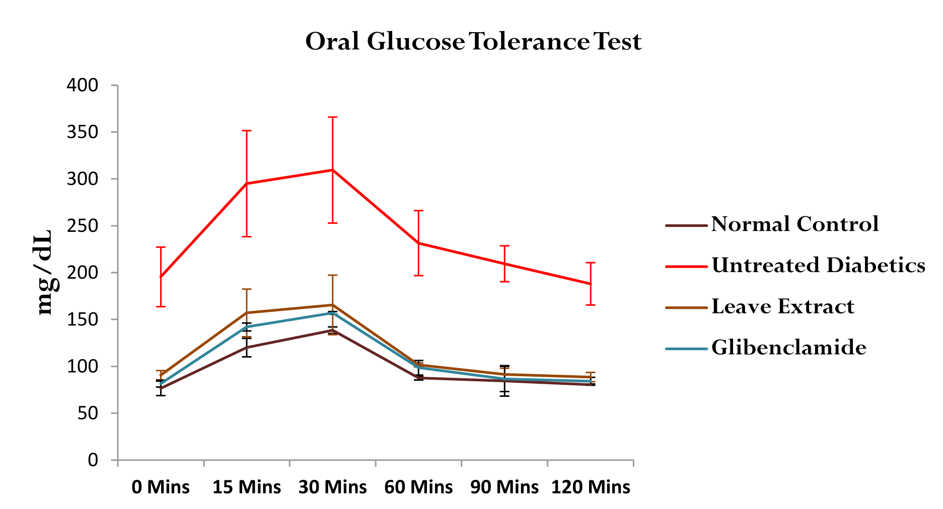The oral glucose tolerance test was carried out on normal and streptozocin-induced diabetic groups. The treatment groups were orally administered 50mg/kg of Bridelia ferruginea methanol leaf extract and 6mg/kg glibenclamide respectively after an overnight fast. Two hours later, glucose solution (2g/kg body weight) was administered orally. Blood samples were collected prior to the administration of the glucose load. Blood glucose values were determined at 15, 30, 60, 90 and 120 minutes later. The blood samples were collected from caudal vein for determination of blood sugar level using ACCU-CHEK Glucometer.