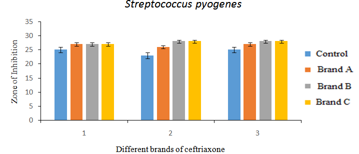 In case of Streptococcus strain, the mean inhibitory zone was 24.33±1.15mm as according to the control. The diameters of the inhibitory zones of ceftriaxone for Ceftriaxone (B) and Ceftriaxone (C) were similar, 27.66±0.57mm, whereas (A) gave 26.66±0.57mm. All these results showed inhibitory diameters were adequately within the required range for Streptococcus pyrogens types B (table 2, figure 2).