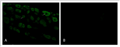 Primary antiserum absorption control and secondary antiserum control experiments were performed for the GLS and VGLUT2 primary antisera and secondary antisera, respectively. For primary antiserum absorption controls, each diluted antiserum was incubated for 24hours at 4°C with the respective antigen at 20mg/mL. Processing of DRG sections for immunofluorescence was carried out as mentioned above. Additional sections were incubated for 72hours at 4°C in either absorbed diluted antisera or non-absorbed diluted antisera. The secondary antisera control sections were incubated in PBS-T in the absence of primary antisera for 72hours at 4°C before continuing with routine processing (Figure 1).