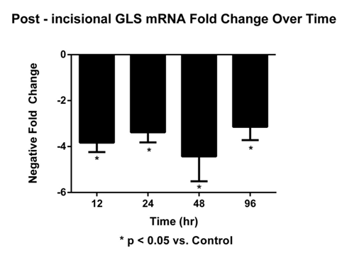 Surgical incision causes a consistent decrease in GLS mRNA in DRG when compared to surgical naïve animals. Sacral level DRG GLS mRNA had a significant decrease in fold change mRNA expression at 12, 24, 48 and 96 hours, respectively. During the same time period, there was a significant increase of GLS protein beginning at 12hours and remaining elevated for 96 hours. The relationship between mRNA and protein is not linear and the mechanisms of mRNA turnover and regulation still need to be defined. Rapid, sustained decreases in mRNA suggest the possibility of a pre-existing pool of GLS mRNA that is altered upon cell soma stimulation. This type of mechanism occurs in the regulation of kidney type GLS. Regulation of kidney type GLS during normal acid-base balance includes the weak binding of zeta (z)-crystallin to GLS mRNA for the rapid degradation of the GLS mRNA by a sequence specific endoribonuclease. During metabolic acidosis GLS mRNA is stabilized through the strong binding of zeta (z)-crystallin to an 8-base AU-rich pH-response element (pH-RE) of GLS mRNA. This type of mechanism allows kidney epithelial cells to adapt rapidly to changing conditions (e.g. metabolic acidosis).24 Further study is needed to relate and characterize these changes in GLS mRNA to the functional aspects of DRG neurons during surgical wounding.