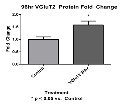 VGluT2 expression was examined at 96 hours post-tail incision (Figure 6). The sacral level DRG VGluT2 protein at 96 hours had significantly (p < 0.01) increased by a 1.87±0.29 fold change when compared to control VGluT2 (Figure 7).