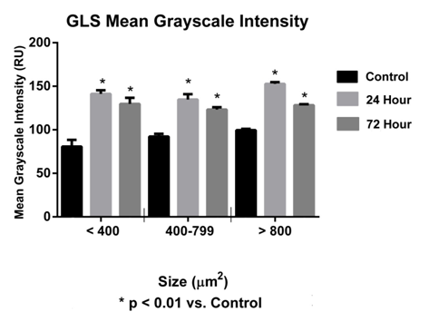 Harlan Sprague-Dawley rats (n=12) were deeply anesthetized at 24 and 72 hours post-incision with tribromoethanol (2.5% w/v) (Sigma-Aldrich; Saint Louis, Missouri) and xylazine (100mg/ml) (Lloyd Laboratories; Walnut, California) and perfused through the ascending aorta with 75mL calcium-free Tyrode’s solution (pH 7.3), followed by 325mL paraformaldehyde/picric acid fixative.8 S1 DRG tissue was collected, post-fixed for 4 hr and incubated in 10% sucrose in phosphate buffered saline (PBS), pH 7.4, overnight at 4°C. DRG tissue sections were cut at 10μm with a cryostat (Leica Microsystems; Buffalo Grove, Illinois) and mounted onto gel coated ProbeOn™ (Fisher Scientific; Waltham, Massachusetts) slides and dried for 60-90min at 37°C. The tissue was rinsed inside slide mailers (5 slides per mailer) three times with PBS, pH 7.4 and placed onto a rocker for 10 minutes during each wash. The primary anti-serum for GLS was rabbit anti-GLS (1:10,000; Curthoys, Colorado State Univ.).13 The primary anti-serum for VGluT2 was rabbit anti-VGluT2 (1:2000; HY-19; Sigma-Aldrich; Saint Louis, Missouri). The anti-sera were placed into a blocking agent consisting of polyvinylpyrollidone (PVP), 0.5% bovine serum albumin (BSA) in PBS with Triton X-100 (PBS-T), pH 7.4 and tissues were incubated in antisera on a rocker in a cold room (4°C) for 72hours.8 The tissues were rinsed three times for 10 minutes each with PBS and placed on a rocker during each rinse. AlexaFluor® 488 conjugated goat anti-rabbit anti-serum (1: 2000) (Invitrogen; Grand Island, New York) was placed into PBS-T, pH 7.4 and tissues were incubated on a rocker for 60minutes at room temperature. The secondary anti-sera were decanted; the tissues were washed three times for 10minutes each with PBS (pH 7.4) and placed on a rocker during washes. ProLong Gold™ (Invitrogen; Grand Island, New York) mounting medium was added to each section of tissue and cover slips applied. Slides were stored at room temperature for 24hours, in a dark area, to allow for complete polymerization. Images were acquired using the 40X objective on an Olympus BX51 epifluorescence microscope (Olympus; Waltham, Massachusetts) equipped with a SPOT RT740 quantitative camera (Diagnostic Instruments; Sterling Heights, Michigan). To ensure proper quantitation, all images were captured using a 300-millisecond exposure with the gain set at 1. Captured images were 1600´1200 pixels with 1.9 pixels per micrometer. Four slides were used for each of the two antisera, GLS and VGluT2. There were a total of 360 images, 180 per antisera, 15images on each of 4 slides. All neuron profiles with a clearly visible nucleus that were not touching the edge of the image were traced on a Cintiq 12WX interactive pen display (Wacom; Vancouver, Washington) using the freehand selections tool in ImageJ (NIH; Bethesda, Maryland). Nuclei were excluded from the regions of interest (ROIs), making each ROI correspond to the cytoplasmic profile of a single DRG neuron. Since all images were acquired at a bit depth of 8, pixel intensities could range from 0 (darkest) to 255 (lightest) on a grayscale. The mean gray value and area in mm2 for each cytoplasmic profile was measured and copied to a spreadsheet. The values for area (µm2) were binned into small (<400µm2), medium (400-799.99µm2) and large (>800µm2) size categories to indicate three broadly defined neuronal subpopulations that correspond to C-, Aδ and Aα/β fibers, respectively.9 The three populations of DRG neurons also have been identified morphologically by immune-labeling patterns.10