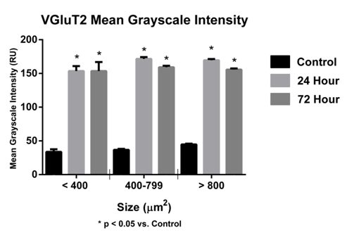 In this study, a significant increase (p<0.05) in GLS-ir in sacral DRG at 24 and 72hours was observed (Figure 8). The MGI for sacral DRG neurons (<400µm2) was 80.76±7.65 (control), at 24hours 141.20±4.26 (experimental) and at 72hours 129.80±6.93 ru (experimental). The MGI for sacral DRG neurons (400-799µm2) was 92.27±3.18ru (control), at 24hours 134.80±6.17 (experimental) and at 72hours 123.20±2.76ru (experimental). The MGI for sacral DRG neurons (>800µm2) was 99.62±1.40ru (control), at 24hours 152.80±1.94ru (experimental) and at 72 hours 128.30±1.22ru (experimental) (Figure 9). A significant increase (p<0.05) in sacral DRG VGluT2-ir at 24 and 72hours was observed (Figure 7) (Figure 9). The MGI for sacral level DRG neurons <400µm2 was 72.71±13.60ru (control), at 24 hours 147.30±5.68 ru (experimental), 72hours 153.60±13.24ru (experimental). The MGI for sacral level DRG neurons 400-799µm2 was 37.17±1.50ru (control), at 24hours 170.40±2.36 (experimental), 72 hours 157.10±1.89 ru (experimental). The MGI for sacral level DRG neurons >800µm2 was 45.03±0.97ru (control), at 24 hours 170.80±1.52 ru (experimental), 72 hours 154.10±1.48ru (experimental) (Figure 10).
