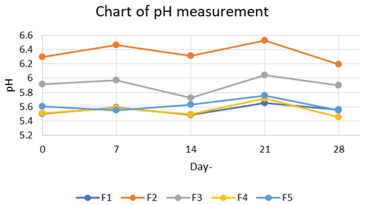 Based on the results of data processing with the One-way ANOVA test, it can be said that there is a significant difference from the data of the pH evaluation test that has been carried out. It can be seen that there is an increase and decrease in pH in each formula. However, when compared to the pH value of each formula, formula 1 (F1) has the lowest pH value among other formulas. This can be due to the fact that this formula contains yogurt with the greatest concentration of 4%, considering that the pH of the yogurt itself is 3.85, where the pH is categorized as low pH. The opposite is seen in Formula 2 (F2) where pH F2 is the highest pH. This is because at F2 contains the active substance of seaweed with the largest concentration of 4%, given that the pH of the seaweed itself is 6.08. However, even though the pH value of each preparation has increased and decreased every week, the pH of the preparation of each formula is still within the skin pH range, which is in the range between 4.5-6.5.