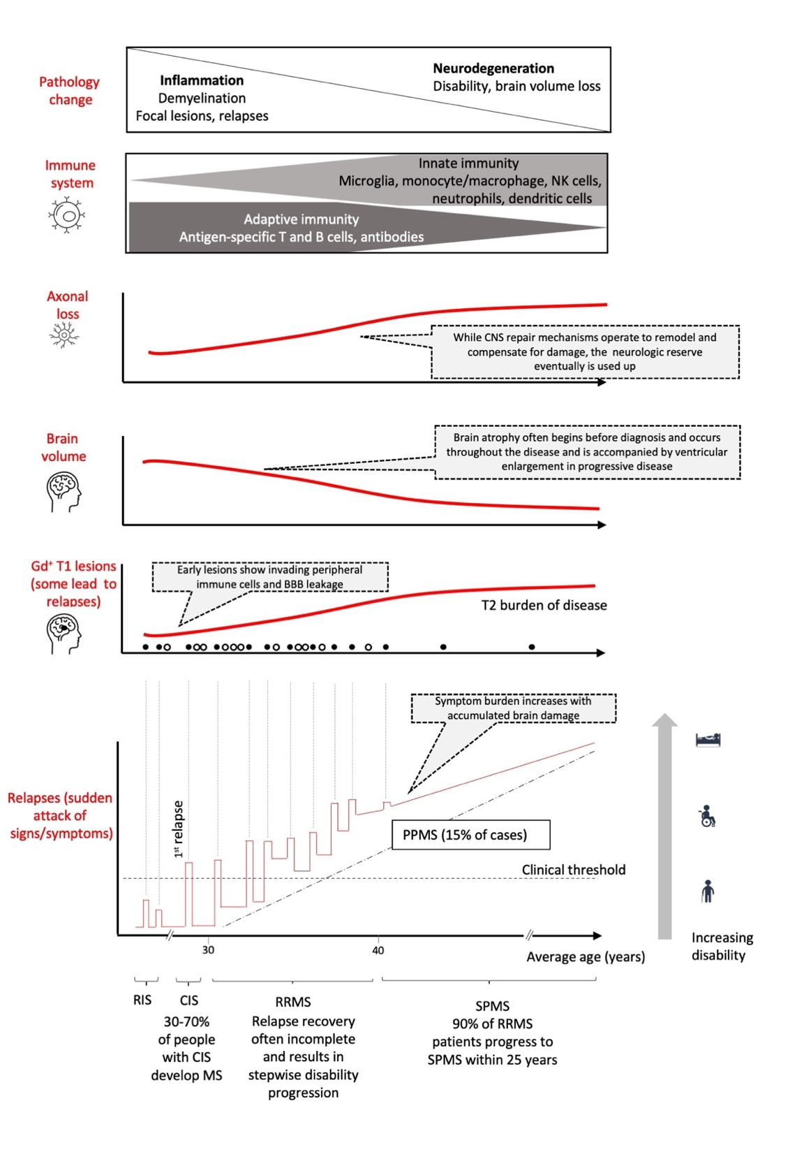 The RRMS phase is associated with relapses (sudden attack of signs/symptoms), nominal disability, and gadolinium (Gd+) enhanced lesions and is primarily propelled by the adaptive immune system.11 The later, progressive course of the disease is characterized by neurodegeneration and progressive disability (with or without superimposed relapses) and is predominately driven by innate immune system.3,16 MRI Gd+ T1 lesions, which are associated with active inflammation due to blood brain barrier (BBB) breakdown and movement of immune cells into the CNS, are more frequent early on in the disease course and not always manifested as clinical relapses.3 However, MRI T2- weighted lesions, which reflect the overall disease burden or lesion load (i.e., total number of lesions, old and new), gradually increases over time and is associated with brain atrophy.
