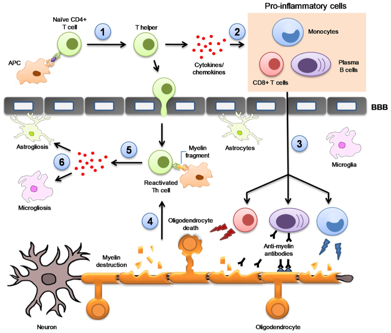 Figure 2 Key immunopathophysiological mechanisms underlying the development of MS. 1) Differentiation of CD4+ T naïve cells into CD4+ T helper cells (Th); 2) Th produces IFN-γ to recruit CD8+ T cells, B cells and monocytes in the periphery; 3) Proinflammatory cells migrate to the blood–brain barrier and pass into the CNS; 4) Infiltrated CD4+ T cells are reactivated upon interaction with myelin fragments presented by resident APCs; 5) proinflammatory cytokines and chemokines released; 6) astrogliosis and microgliosis. Reproduced from Celarain N, Tomas-Roig J. J Neuroinflammation. 2020;17:21.19 Open access; refer to http://creativecommons.org/publicdomain/zero/1.0/).