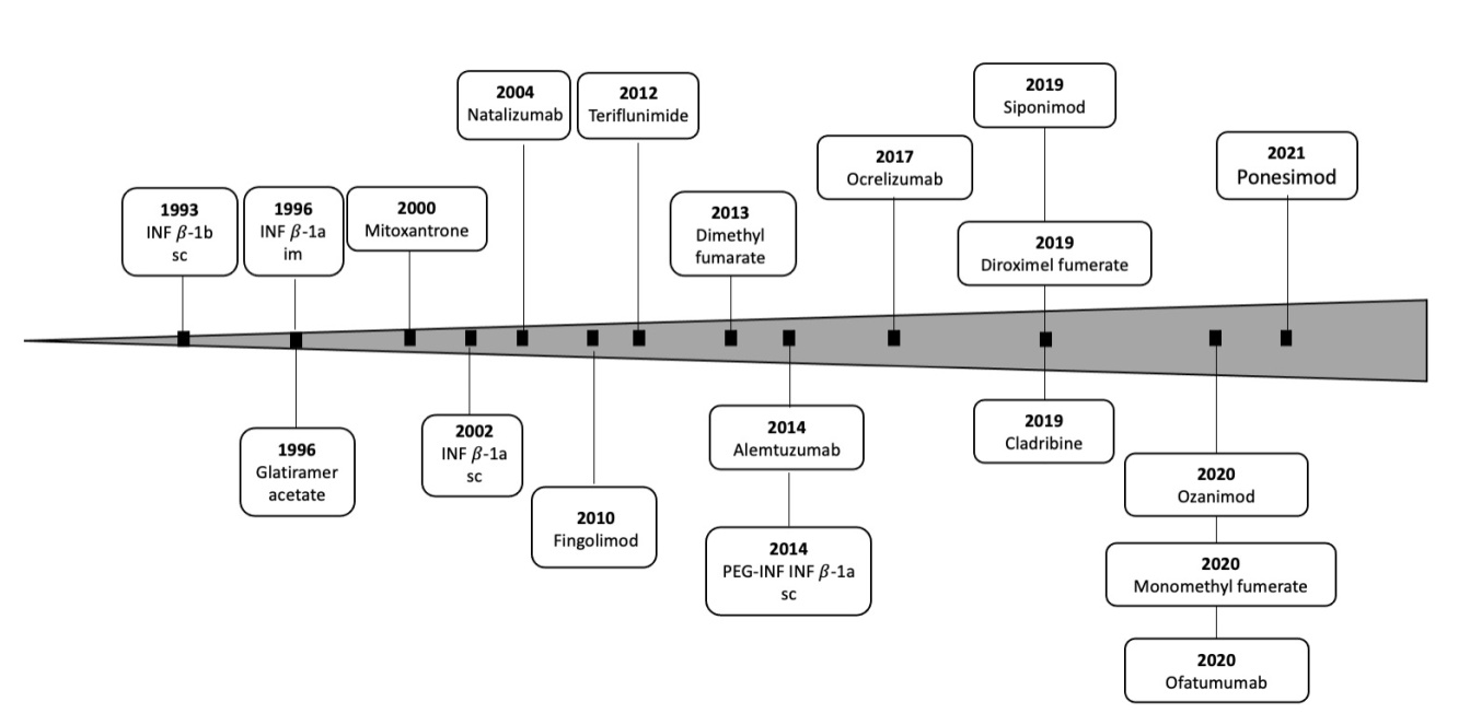 Figure 3 Timeline for approval of therapies for MS in the US. Medications commonly prescribed off label for the treatment of MS were omitted. Based in part on Melamed E and Lee M W. Front Immunol. 2020;10:2954.39
