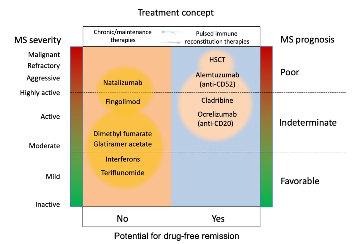 DMDs can also be differentiated according to overall treatment concept: that is, chronic maintenance/escalation therapy and immune reconstitution therapy or IRT (Figure 4).37,43 IRT was originally used to describe immunological outcomes of allogenic and autologous hematopoietic stem cell transplantations (HSCT) whereby the repertoire of adaptive immune cells was reestablished. The overarching goal being the elimination of pathogenic immune cells via immune cell depletion and repopulate with new cells offering immune tolerance.44 IRT, also referred to immune depletion and repopulation therapy, is characterized by a short course of therapy either as a single therapy (e.g., autologous HSCT or intermittent/short course, e.g., cladribine and alemtuzumab) followed by treatment-free periods.44 IRT has the potential to induce longer-term remission that goes beyond the short course dosing period.37 It remains unclear, however, whether IRT agents such as alemtuzumab and cladribine achieve a reset of the adaptive immune system or simply a consequence of different dynamics of repopulation for different cell types.44