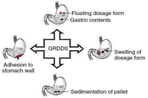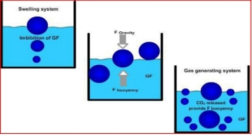 Buoyancy: Tablet’s contact with the stomach fluid after swallowing causes the gas- generating substances (such as sodium bicarbonate and gastric acid to react to release carbon dioxide it sweels and becomes buoyant, allowing the tablets to “float” on the surface of the stomach contents since the created gas is retained within the tablet matrix.