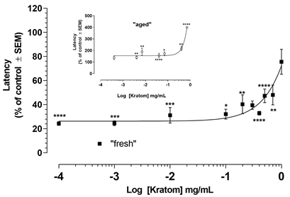 Figure 1A shows the effects of different Kratom concentrations on seizure latency induced by PTZ Fresh KR extracts markedly reduce seizure latency at low concentrations (10-4-10-1 mg/mL). However, at 1.0 mg/m, the proconvulsant effects are lost. Latency at higher concentrations could not be tested because of the excessive sedation. In contrast, Fig 1B shows that "aged" KR extracts lose the proconvulsant effects, becoming anticonvulsant at 0.01 mg/ mL or higher.