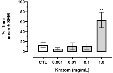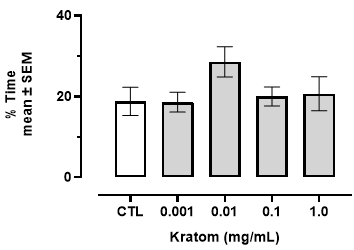 Kratom did not affect the time spent in the central area of the open field arena shown in Figure 2A. In contrast, "dispersion" (shoaling) was lost at 1mg/mL Figure 2B.