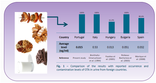 Previous national urine surveys confirmed a continuous and widespread exposure of the Portuguese population to ochratoxin A (OTA). Nevertheless, despite OTA in urine provide the ultimate evidence that exposure has taken place, it does not point out the food source of contamination involved. In any case, the observed absence of persistent significant differences between most of the anthropometric parameters, seasonal or regional factors strongly suggested that the source of OTA was transversal to the population, which means that, considering that the major source of exposure is the ingestion of contaminated food, some common dietary foodstuff is probably implicated.