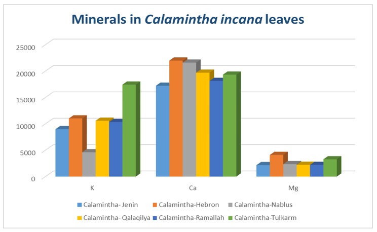 The growing global use of medicinal plants has raised concerns about their safety, efficacy, and quality. While mineral content in various medicinal plants has been studied in developed countries, no data exists for C. incana in Palestine. In this study, sixteen minerals were analyzed, including Ag, Al, Ba, Ca, Cd, Co, Cr, Cu, Fe, K, Mg, Mn, Mo, Na, Ni, and Zn. Method validation followed USP <233>, with recoveries and RSDs within acceptable limits (70–150% recovery and ≤20% RSD), confirming the accuracy and precision of the results.14 Minerals are vital for plant and human health. In C. incana leaves, calcium was the most abundant (17,226–22,001 mg/kg). The second most abundant was potassium (4,609–17,435 mg/kg), and Magnesium ranked third (2,162–4,102 mg/kg). Notably, the leaves showed high potassium and low sodium content—an ideal combination for supporting cardiovascular health.15