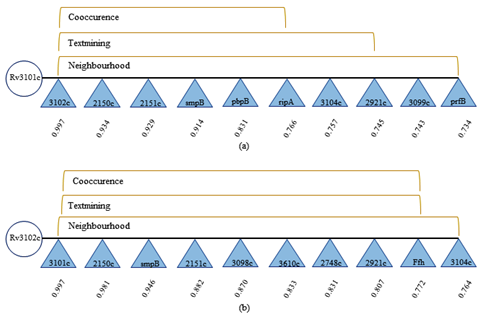 Figure 2 The protein-protein interaction was done by STRING server (a) R3101c and Rv3102c proteins where score shown separately for each data confirms cut off value within [0-1], low confidence: scores <0.4; medium: 0.4 to 0.7; high: >0.7.