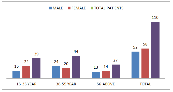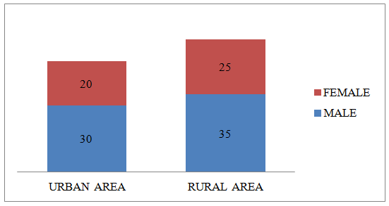 Table1 & Graph 1 shows distribution of patients in the study. There were 50 (45%) patients from urban area and 60 (55%) from rural area. The male patients were 65 (59%) and female were 45(31%). Location of hospital near rural area could be cause of more patients from rural area. Social position of males could be cause of predominance of male patients.