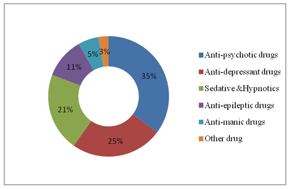 Table 5 & Graph 5 shows category of drugs given to the patients. Antipsychotics were given to 35. % patients, antidepressants to 24.5 %, sedatives and hypnotics were given to 20.9 %, anti epileptic to 10.9%, anti maniac drugs to 5.5% and other drugs 3.0% patients.