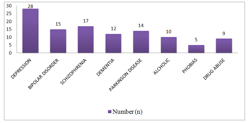 Table 6 & Graph 6 shows diagnosis of study population. 25.5% patients were suffering from depression, 13.63% from Bipolar disorder, 15.46% from Schizophrenia, and 10.90% from Dementia, 12.72% from Parkinson Disease, alcohol abuse, 9.09 % from phobias, 4.56 and % from 8.18 other drugs abuse