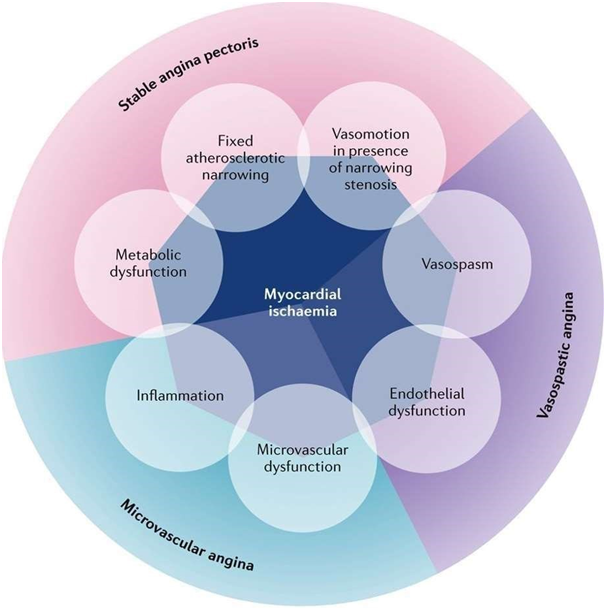 Stable angina occurs when myocardial ischemia is caused by fixed atherosclerotic narrowing of one or more epicardial coronary arteries. In some circumstances, the angina is associated with a coronary spasm and metabolic dysfunction. Vasospastic angina occurs when myocardial ischemia is caused by a coronary artery spasm with or without endothelial dysfunction. Microvascular angina refers to the absence of an obstructed epicardial coronary artery. Myocardial ischemia in this case can be caused by microvascular and/or endothelial dysfunction and inflammation.