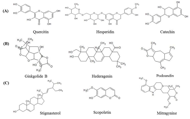 Passiflora (passion flower extract) and valerian are two well studied medicinal plants and a number of preclinical and clinical studies demonstrate the effectiveness of these two herbs in treating anxiety, depression and sleep disorders.62,70 Many polyherbal formulations available commercially or in clinical phases for treating anxiety contain passiflora and valerian as their active component.61,63,64,71‒73 Various in-vivo models used for the study of the activity of medicinal plants in the treatment of neurological disorders mentioned in Table 2. It is found that most of the medicinal plants found to be active in animal models have flavonoids (quercetin, iso-quercitin, catechin, rutin, hesperidin), terpenoids (ginkgolide A, ginkgolide B and ginkgolide C, hederagenin, Podoandin), amide alkaloids (Leatispiamide A), saponins (Bacoside A), phytosterols (stigmasterol), coumarins (Scopoletin), opioid (Mitragynine) and other constituents as active agents (Figure 1). There are several widely accepted and established animal models of experiments being used for in-vivo evaluation for many mental disorders.74,75 For example, learning and memory models such as radial arm maze, Morris water maze, and y-maze are used to evaluate the effect of medicinal plant extracts in Alzheimer's disease in rats. The basis of learning and memory animal models is to determine how a normal or treated, and damaged or untreated brain processes and retains information when confronted with the psychological nature of a certain task.76 For mood disorders due to anxiety, elevated plus maze is a commonly used model while tail suspension test and forced swim test is used for depression studies. Depression experimental models are designed based on a concept known as “searching-waiting strategy”.77 Theoretically, in these, the tests, a normal animal subjected to an aversive situation alternates between two kinds of behavior, agitation, and immobility. These can be named as searching-behavior characterized by intense motor activity and expense of energy, and as waiting-behavior characterized by immobility and energy saving. The choice sequences between these kinds of behavior can be named as the searching-waiting strategy.