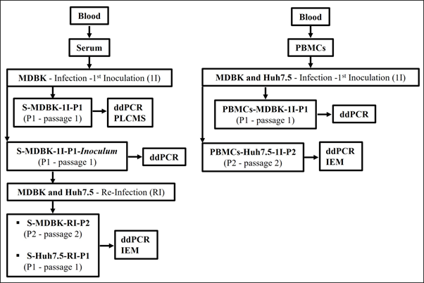 Keywords: HCV, OCI, Huh7.5 cell line, MDBK cell line, HCV/OCI transmission, Droplet digital PCR, LC-MS, IEM