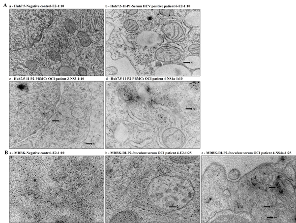 Figure 2 HCV specific immunostaining for the HCV E2, NS3 and NS4a specific regions by IEM. (A) IEM detection in Huh7.5 cell cultures infected with serum and PBMCs samples of the 4 OCI and 2 HCV positive patients. (a) Huh7.5-Negative control-E2-1:10, (b) Huh7.5-1I-P1-Serum HCV positive patient 6-E2-1:10, (c) Huh7.5-1I-P2- PBMCs OCI patient 3-NS3-1:10 and (d) Huh7.5-1I-P2-PBMCs OCI patient 4-NS4a-1:10. The immunogold particles were 10 nm in diameter. Scale bars: (a and c 0,5 µm); (b 0,2 µm); (d 200 nm). (B) IEM detection in MDBK cell cultures reinfected with inoculum serum samples. (a) MDBK-Negative control-E2-1:10, (b) MDBK-RI-P2-inoculum serum OCI patient 4-E2-1:25, (c) MDBK-RI-P2-inoculum serum OCI patient 4-NS4a-1:25. The immunogold particles were 10 nm in diameter. Scale bars: (a 200nm); (b and C 100 nm).