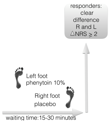 It is exactly this we explored during the last years, based on our topical formulation containing phenytoin 10%. For the purpose of the precision medicine we developed a single-blind placebo-controlled response test (SIBRET), see Figure 1. For the use of SIBRET a painful polyneuropathy is very well suited, because symptoms are mostly symmetrical (e.g. both feet). Examples of such polyneuropathy are PDN, CIAP and CIPN. Mostly the pain intensity is the same in both areas, and is measured on the 11-point numerical rating scale (NRS). On one foot the active cream will be applied and on the other foot placebo cream. The patient only knows that 2 different creams are applied on both feet. Responders are patients who experience 1) within 30 minutes, 2) a pain reduction of at least 2 point on the NRS in favor of the active cream. Responders will be prescribed the active cream. Non-responders can do another SIBRET with another topical analgesic. This way, no treatment delay will arise, and is in line with precision pain medicine.9