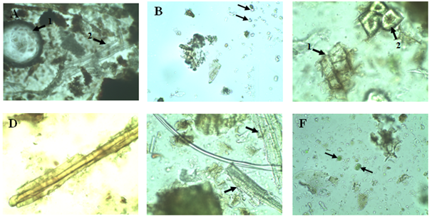 Figure 2 Micrograph of the powder of dry bark of Vernonia conferta: observation with water. (A) 1. Conductive tissues. 2. Cluster of Liberian fibers. (B) Calcium oxalate crystals. (C) 1. Suber. 2. Collenchyme. (D) Fragment of epidermis covered with toothbrushes. (E) Sclerotized fibers. (F) Primary Perimedullary Screened Tissues (Source: present study).