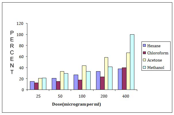 As can be seen from the Figure 1 methanol extract exhibited highest activity (100%) at a higher dose of 400microgram/ml, all the extracts showed dose dependent activity. Significant cytotoxic activity could be due the presence of saponins which are well known to possess such cytotoxic potential.9