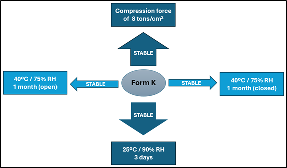 Stress stability conditions: At 40°C and 75% relative humidity (RH) for one month, both in open and closed containers, form K remains stable.