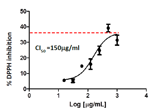 The ability to sequester free radicals is one of the primary criteria of antioxidant activity. In this sense, C. longa extracts were evaluated for their ability to sequester the DPPH radical in vitro. Figure 1 shows the concentration-response curves of the inhibition percent of this radical by the nutraceutical. As it is shown in the graph, the nutraceutical is capable of sequestering DPPH depending on the concentration used, with an IC50 of 150ug/ml.
