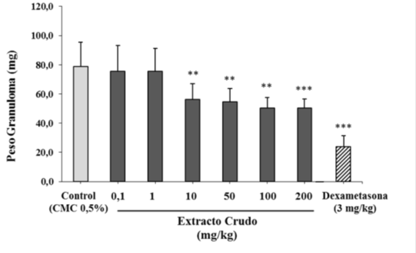 From the next day after cotton implantation and for 8 consecutive days, the nutraceutical of C. longa was administrated at 6 different concentrations (0.1, 1, 10, 50, 100 and 200mg/kg) using intragastric cannula. The euthanasia of the animals was performed, the granulomas formed were removed from the tissue, and placed in Petri dishes to be weighed in analytical balance to determine their wet weight (this value indicates the action of the substance at the level of edema in the inflammation). Subsequently, they were dried in an oven for 24 hours and weighed again to determine their dry weight (related to the amount of connective tissue present). Control animals only received 0.5% carboxy methyl cellulose (CMC), which constituted the vehicle in which the products were solubilized. Dexomethasone was used as a positive control of the experiment and was administered in a reference group at 3 mg/kg, intra-peritoneally approximately 3 h before sacrifice.