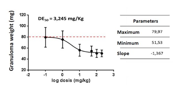 Figure 3 Dose-response curve of the anti-inflammatory activity of the nutraceutical of C. longa. The average weight of the granuloma of the treated animals is shown according to the logarithm of the dose in mg/kg. The nutraceutical inhibits granuloma formation in this model in a dose-dependent manner. Inhibition parameters were calculated using GraphPrism 5 software and an average effective dose (ED50) of 3,245 mg/kg body weight was determined.