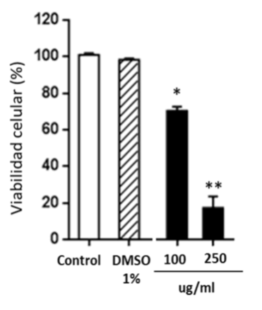 Figure 4 Cytotoxicity of the nutraceutical of C. longa in NCI-H460 cells. The percentage of cell viability of the NCI-H460 line, untreated (control), treated with 1% DMSO or exposed to concentrations of 100 and 250ug/ml is shown; *p<0.05 and **p<0.01 with respect to control cells (Anova and the Dunnett test a posteriori). The cells were incubated with the products for 48 h, in triplicate. The graph was generated using GraphPrism 5 software.