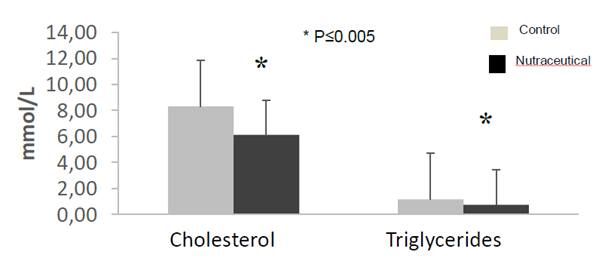 Groups of 5 female mice of the 42-week ApoE knockout line were used. The nutraceutical equivalent to 200 mg/ kg was supplied daily orally daily with intragastric cannula for three months. Determinations of cholesterol and triglycerides were performed at the end of the test with the extraction of blood samples through the retro-orbital plexus.