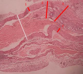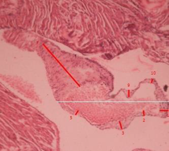 Figure 7 ApoE knock out mouse treated with the nutraceutical, observe atheroma with smaller dimensions than untreated animals. H.E.x120.