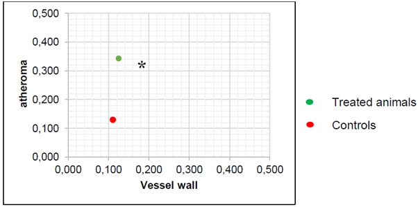 Figure 8 Ratio vessel wall/atheroma in APOE knockout mice (n=5, * p <0.05, Anova test).The ratio for the treated animals are significative lower that non-treated animals which confirm the anti atherogenic effect of the nutraceutical.