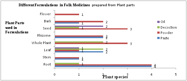 The medicinal plants and their parts to cure ailments were documented (Figure 3) are used to prepare various formulations are prevalent since hundreds ofyears and are orally communicated from one generation to another, the discussions with local healers and villagers further revealed that the preferences in species to cure of ailments vary from one species to another species as a number of plants are used in cure of a particular ailment and the species, plant part used, formulation such as powder, paste, decoction, extract also vary from village to village in different tribal pockets, based on the ethnic culture and seasonal availability of medicinal plants as presented in Table 1. Based on the findings of present study, it has been found that tribal communities had rich knowledge on herbal folk medicines and distribution of plants around their habitat and used by them in cure of various ailments, and this vital knowledge is transmitted from one generation to another through oral communication as reported by.6,8,10,14,21,22,25–32,36,39,40 The villagers use different forest plant species in their daily life. Documentation of such information’s is useful for further generation as well as for their daily life. Hence due to changing life style detailed study of ethno-botanical studies became necessary to document traditional knowledge as it is at the stage of disappearance.