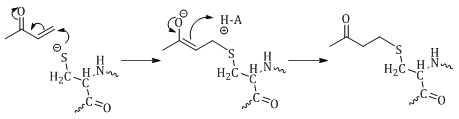 The final mechanism of inhibition discussed in this paper is that of Michael acceptors. The Michael reaction involves nucleophilic attack of and α, β-unsaturated carbonyl (Figure 9).29,42 Michael acceptors can bind either reversibly or irreversibly to the active site thiol of cysteine proteases depending on α, β-unsaturated carbonyl system.29,42 An example of a reversible Michael acceptor is α, β-unsaturated ketone.29,42