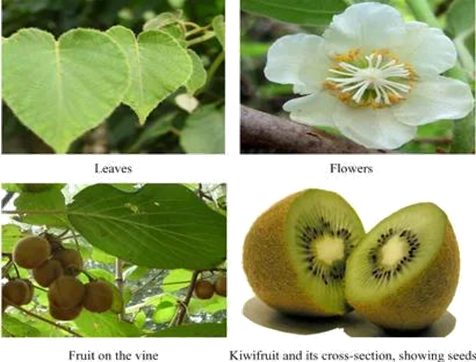 The scientific botanical name of Chinese Gooseberry is Actinidia chinensis, from the family of Actinidiaceae. The plant is characterized by its large, deciduous, and dioecious branching stems that coils itself around nearby plants for structural support and can extend up to 30 meters in length. This kiwi fruit species gave rise to the cultivated variety of modern kiwi fruit we consume today, known as Actinidia deliciosa.6 It thrives in dense shrubs and oak woods on slopes or in ravines.7 The heart-shaped leaves are the striking features of the plant, where it can turn reddish in autumn and may grow up to 25cm in width. Both the leaves and fruit can be eaten. The golden-yellow, rounded fruit with smooth, golden-brown skin is rich in nutrients and contains small, edible seeds. The leaves are suitable for consumption once cooked when it is necessary. It produces sweet-smelling, creamy-white to yellowish flowers in the spring. The leaves, flowers and fruit for Chinese gooseberry is illustrated in Figure 1. The botanical classification of Chinese gooseberry is explained further in Table 1.